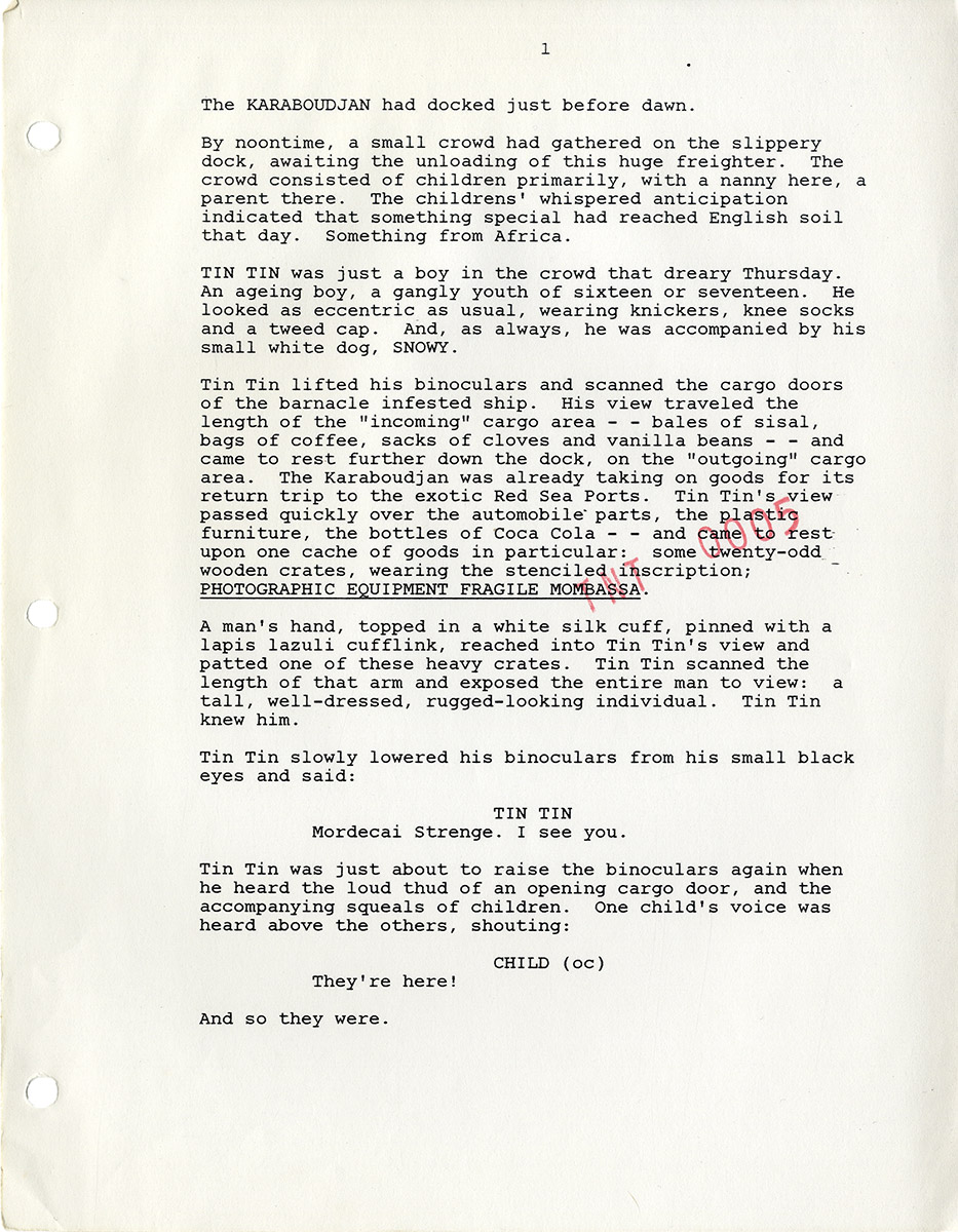 Melissa Mathison had recently written the screenplay for Steven Spielberg’s E.T. the Extra Terrestrial. This film never got made, and it was only three decades later that Spielberg got to make The Adventures of Tintin, released in 2011. Because this script was one of a small number printed only for internal use at Amblin, it is an unusually scarce one.