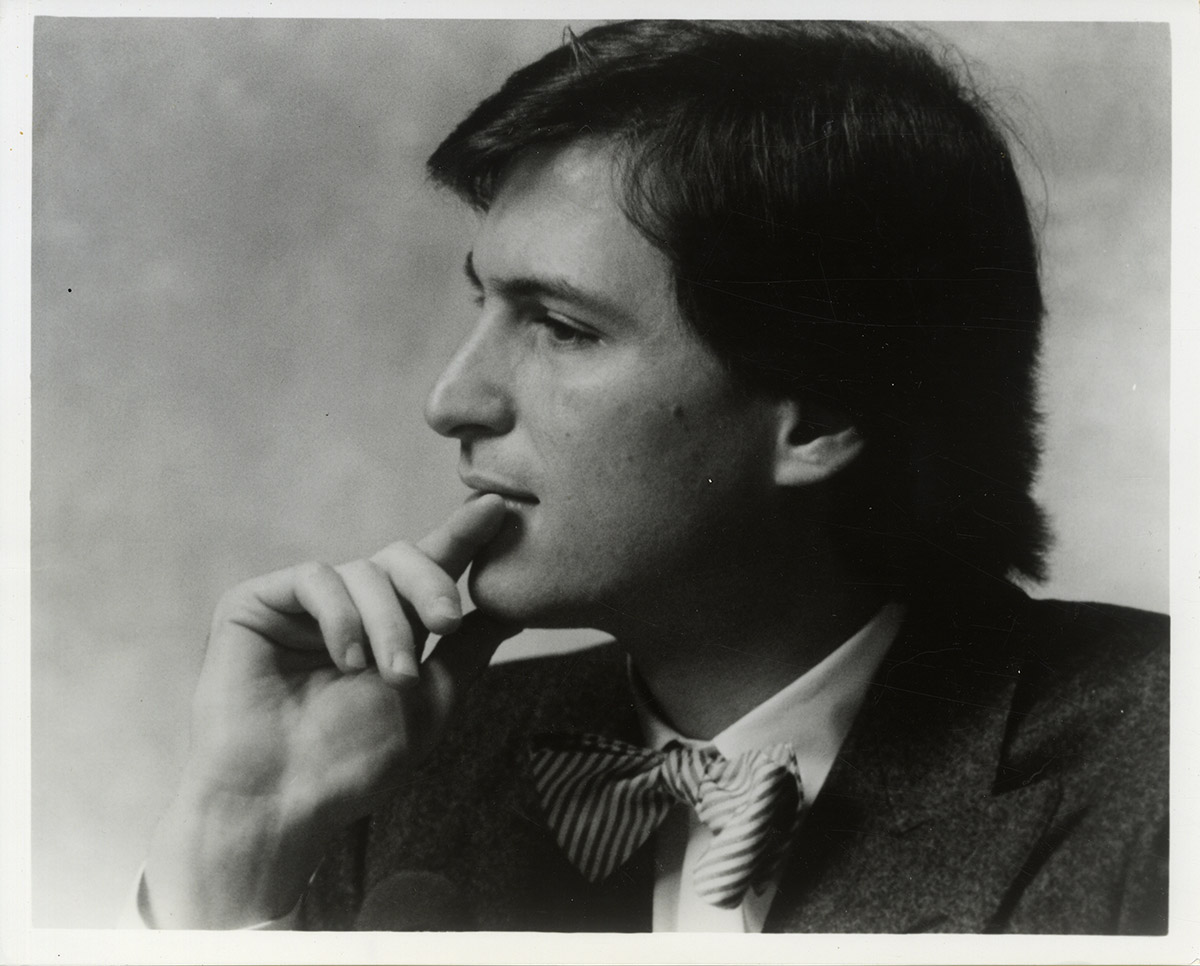 Steve Jobs. [Cupertino, CA]: Apple Computer, Inc., [ca. 1985]. Vintage original 8 x 10″ (20 x 25 cm) black-and-white portrait. With sticker and holograph text on verso both crediting the photo to Apple Computer, Inc. Fine.