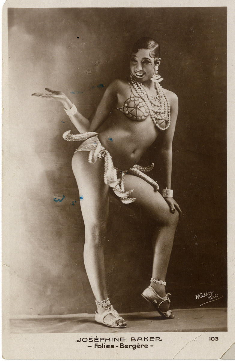 A provocative pose of the entertainer Josephine Baker who, banned in America, made her mark in entertainment history presenting her innovative dance and costuming to Paris of the 1920s.