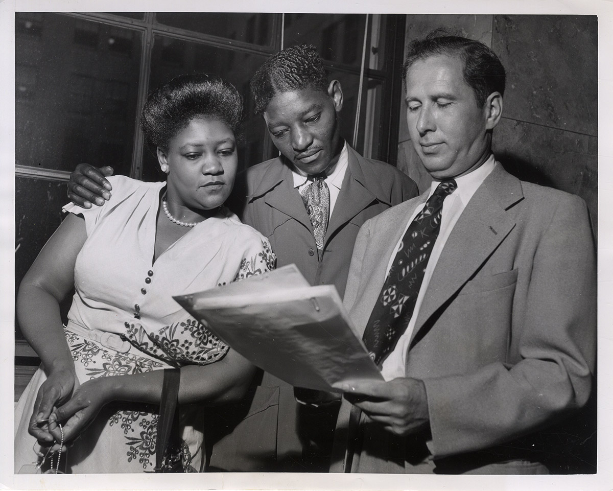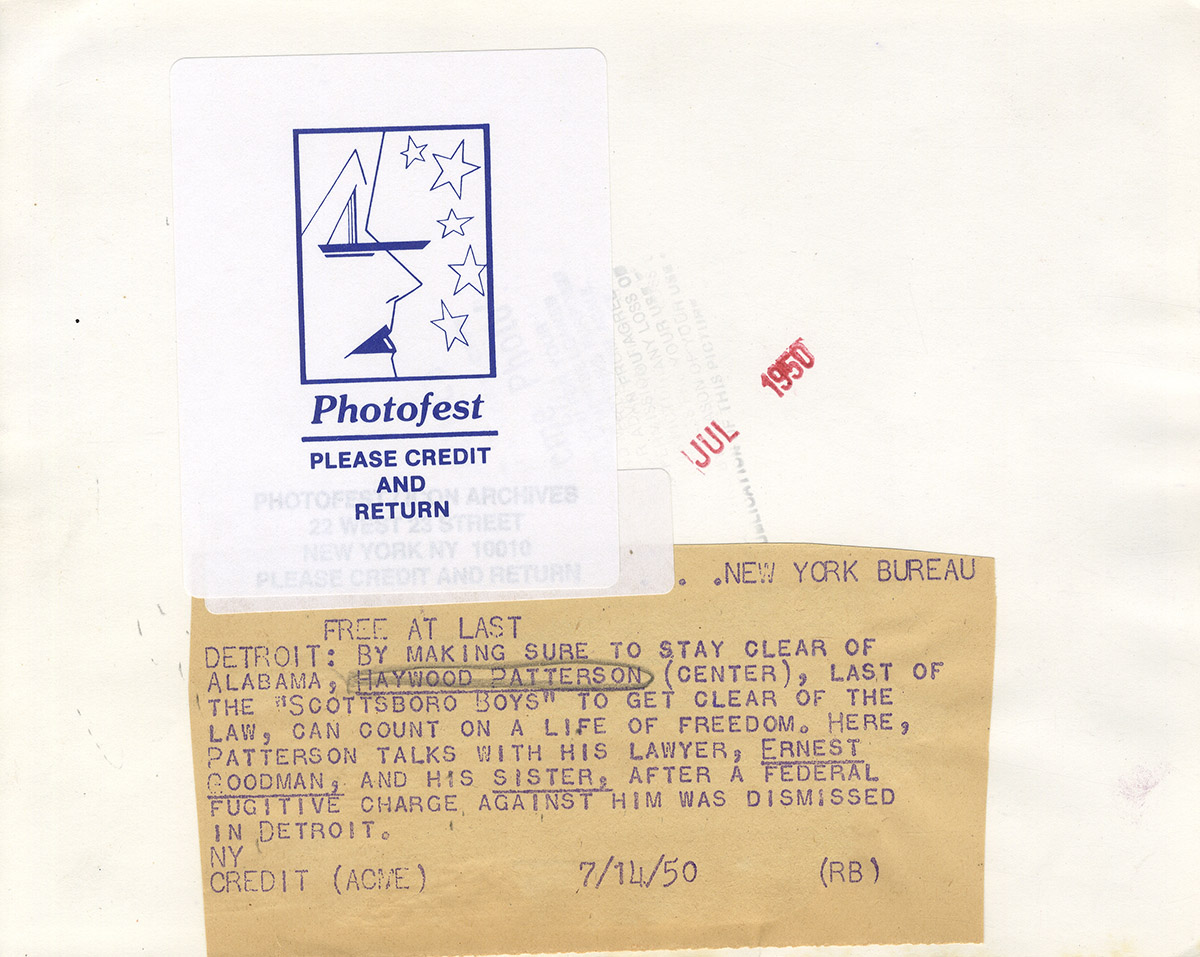 From caption: “By making sure to stay clear of Alabama, Haywood Patterson (center), last of the Scottsboro Boys to get clear of the law, can count on a life of freedom. Here Patterson talks with his lawyer, Ernest Goodman, and his sister, after a federal fugitive charge against him was dismissed in Detroit.”